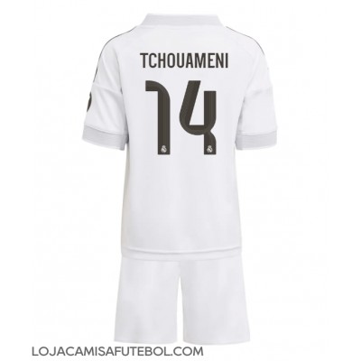 Camisa de Futebol Real Madrid Aurelien Tchouameni #14 Equipamento Principal Infantil 2025-26 Manga Curta (+ Calças curtas)